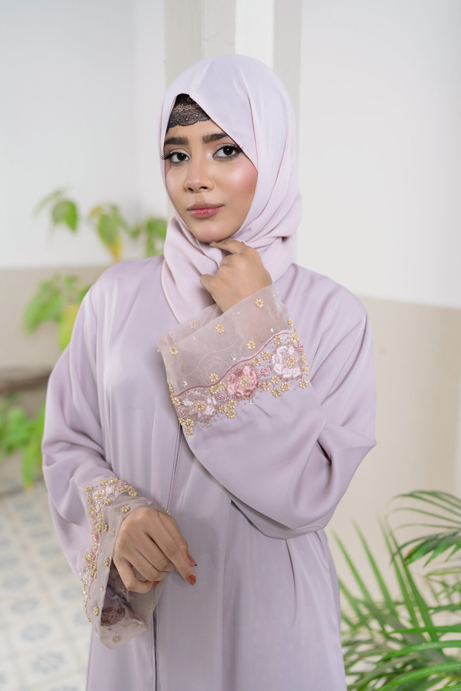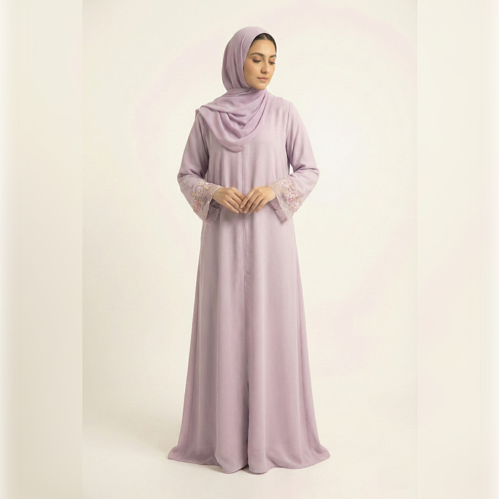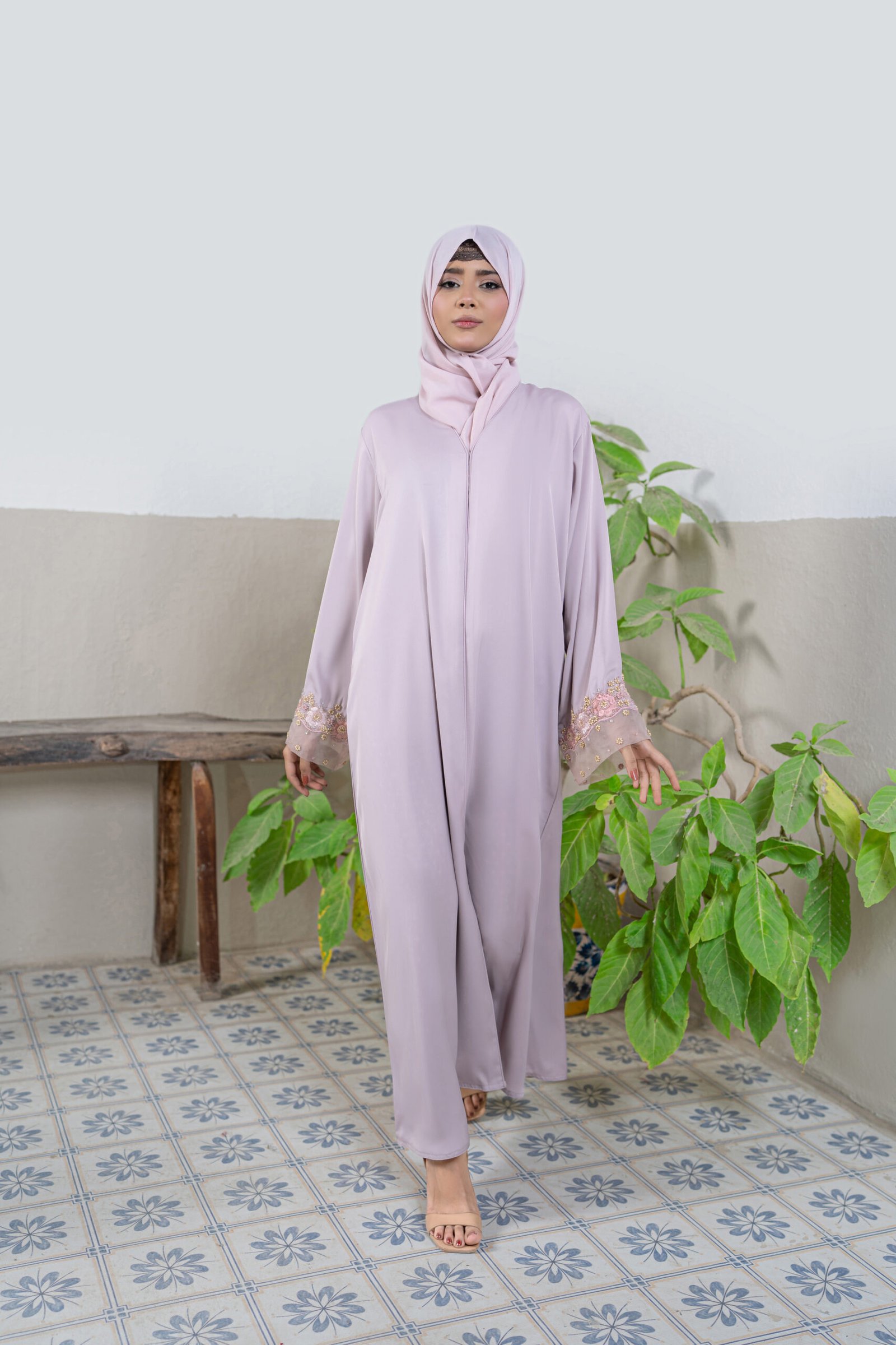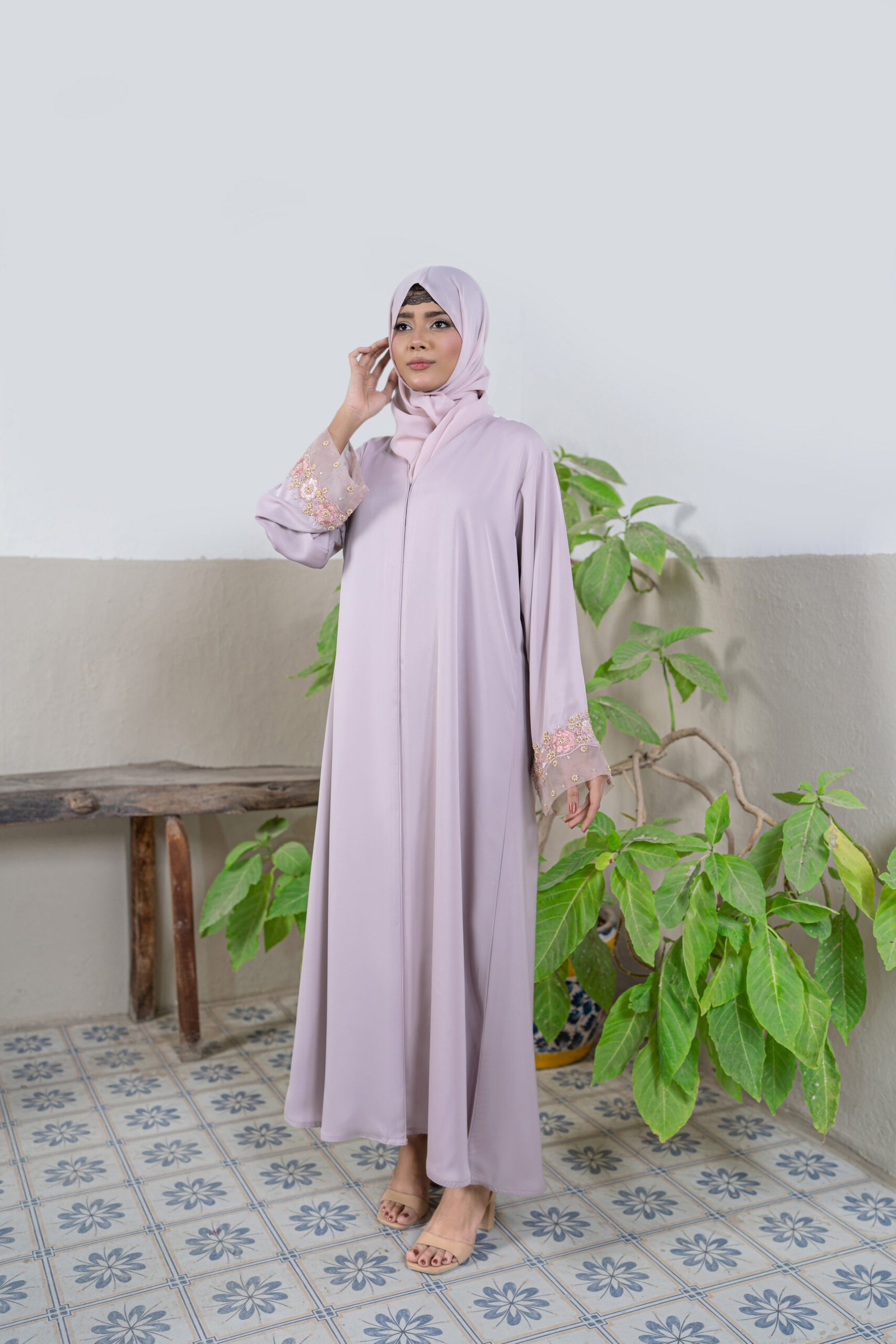 Embrace effortless elegance with the Aniqah Abaya. Crafted from premium, breathable Nidah fabric in a dreamy Lilac shade, this design features delicate floral embroidery on the cuffs. A perfect blend of comfort and sophistication for your modest wardrobe.