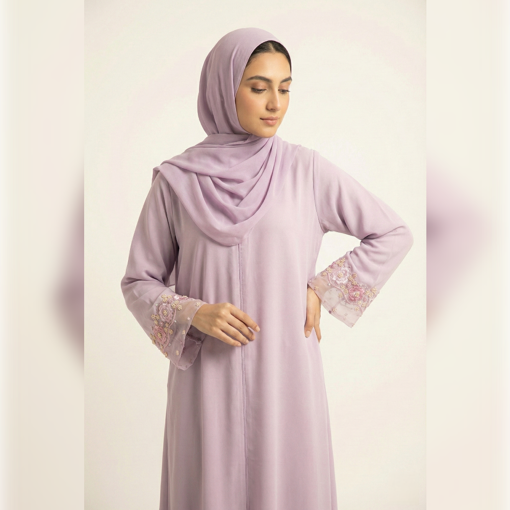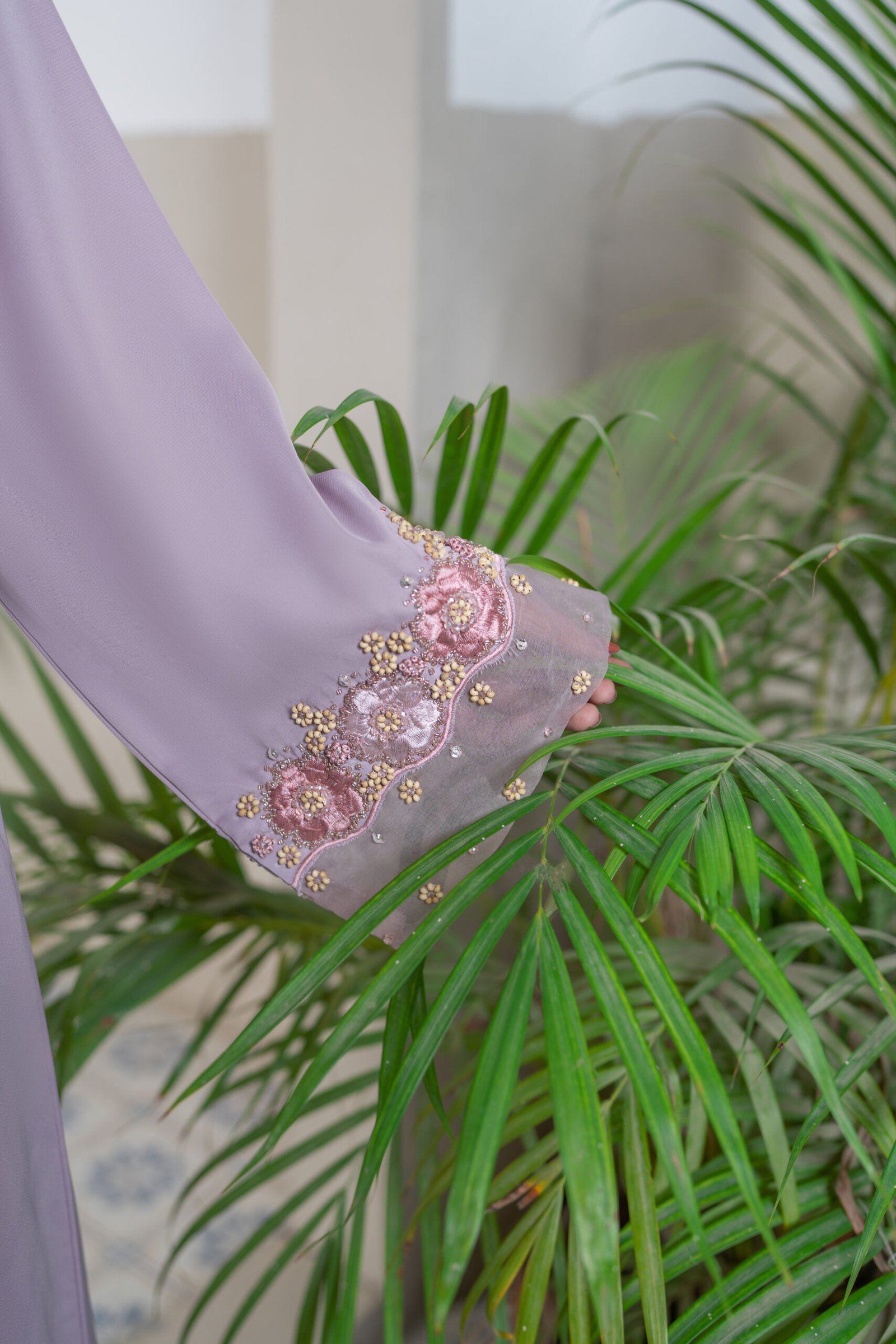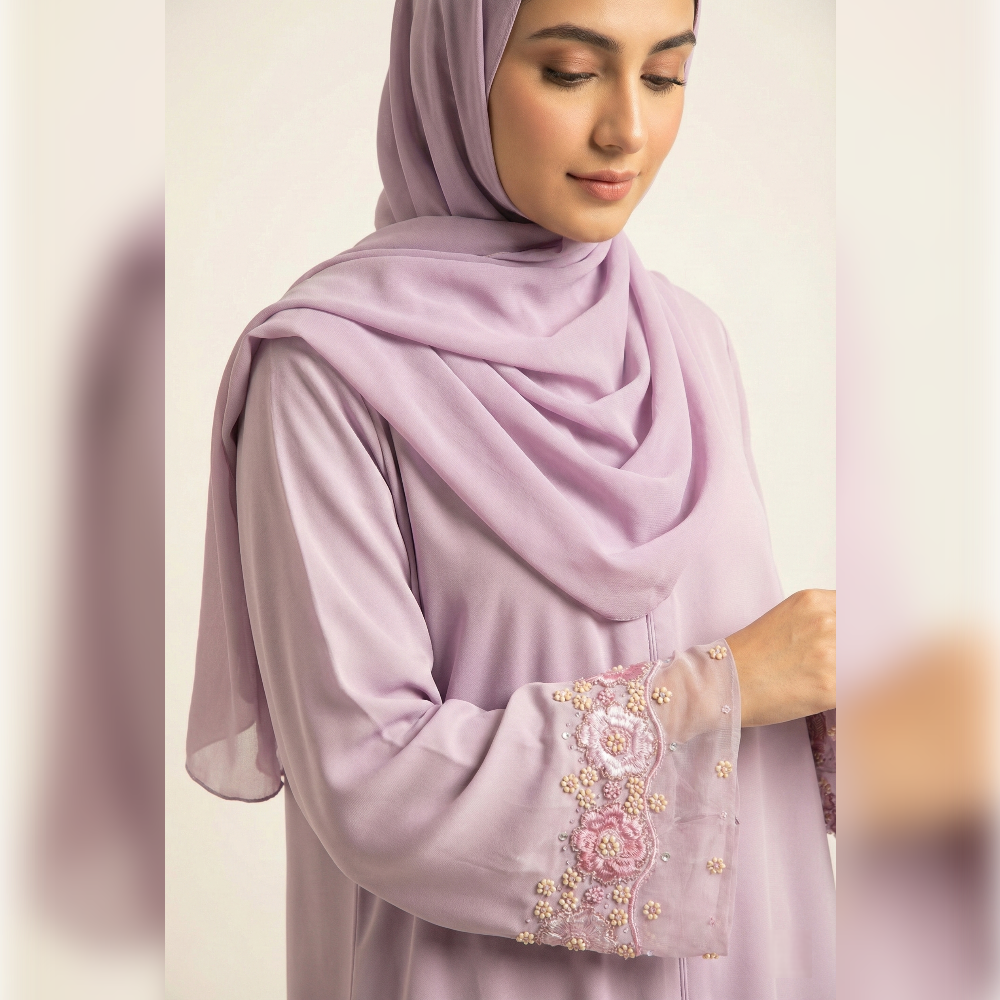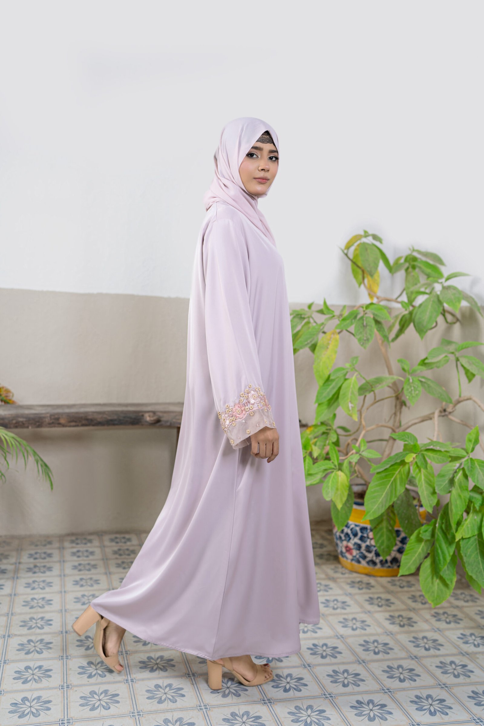 Embrace effortless elegance with the Aniqah Abaya. Crafted from premium, breathable Nidah fabric in a dreamy Lilac shade, this design features delicate floral embroidery on the cuffs. A perfect blend of comfort and sophistication for your modest wardrobe.