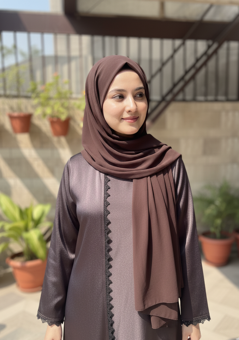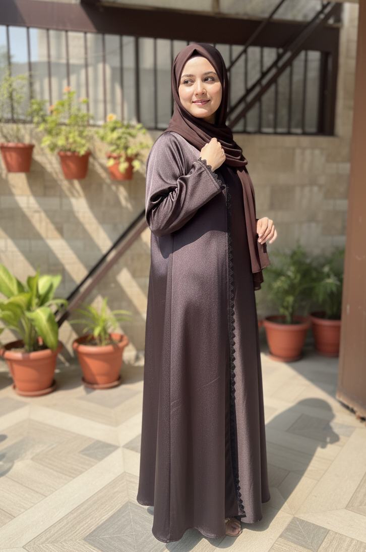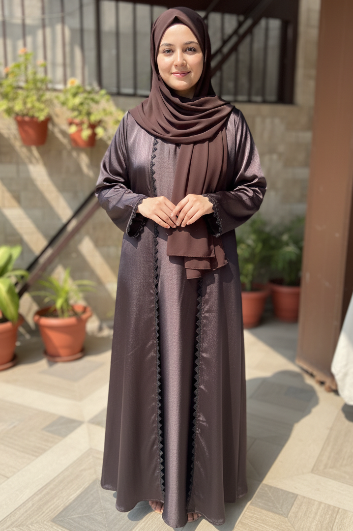 This abaya features a subtle metallic sheen in a deep mocha tone, highlighted by elegant lace trimming along the front and cuffs. Paired with a matching chocolate-brown hijab, it creates a refined and timeless look perfect for formal occasions.