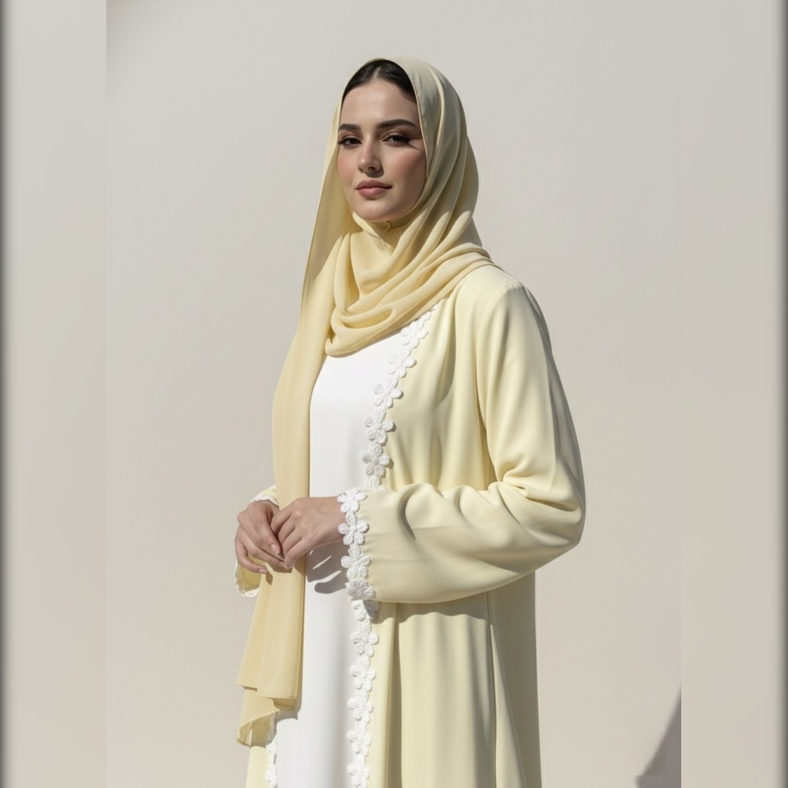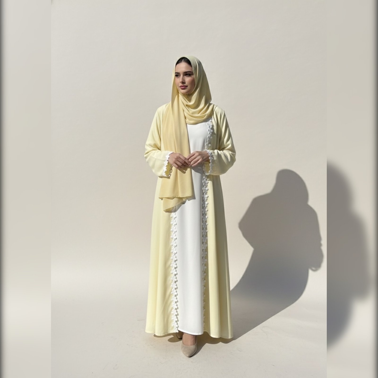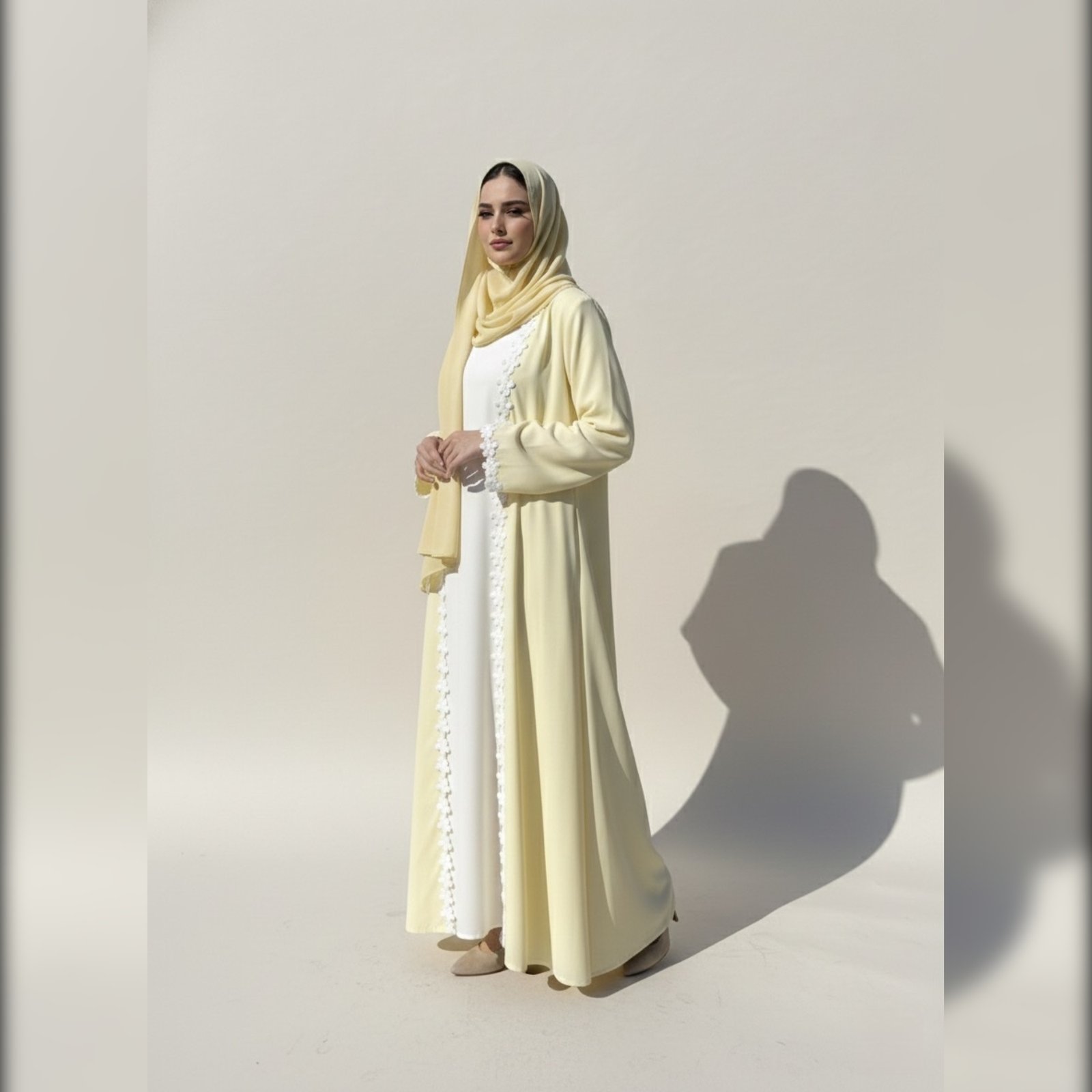 Radiate elegance with the Inara Abaya. Crafted from premium Wool Peach fabric, this soft yellow and white ensemble features delicate floral lace accents. Lightweight and flowy, it offers the perfect blend of comfort and sophistication for any occasion.