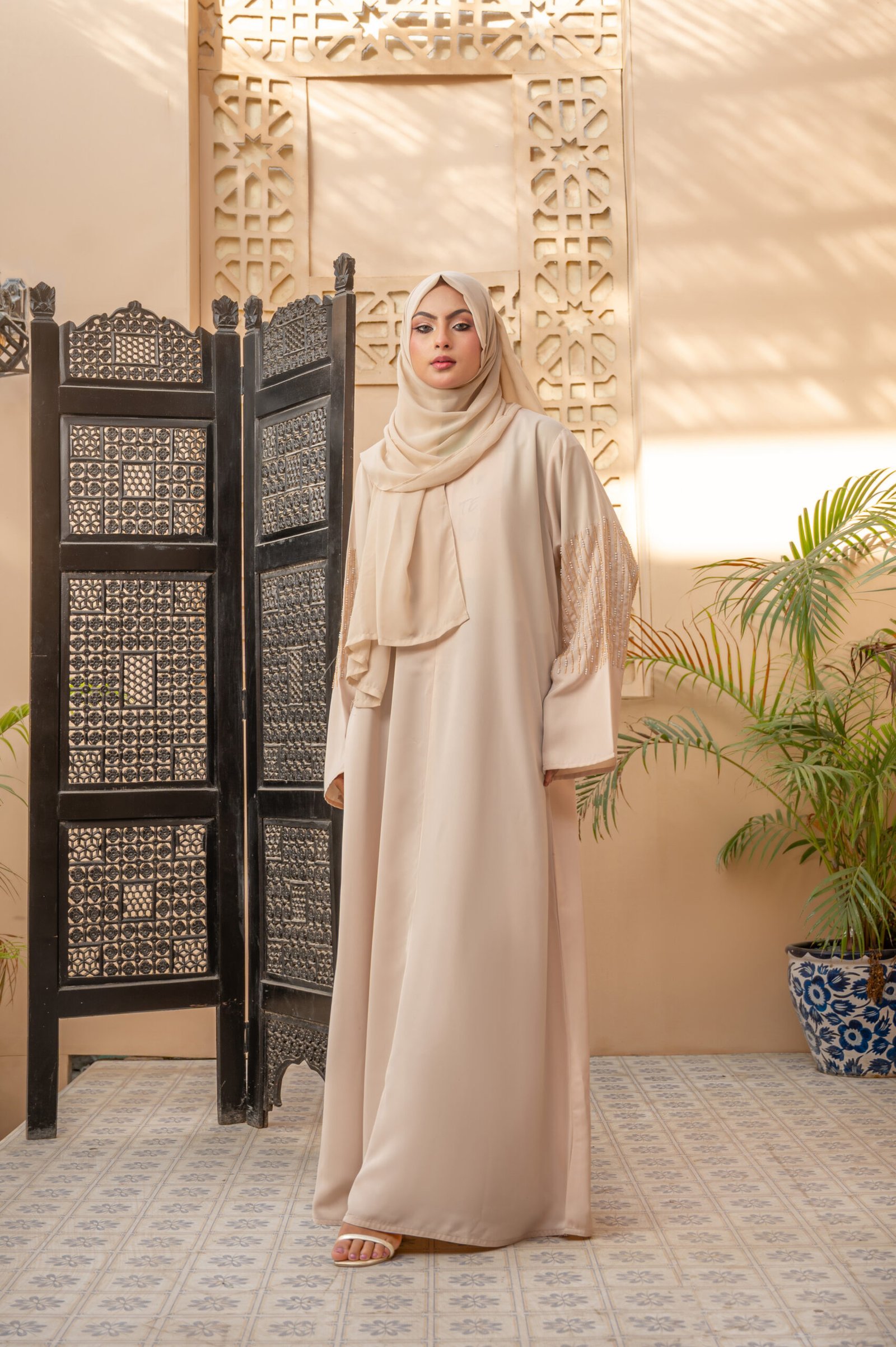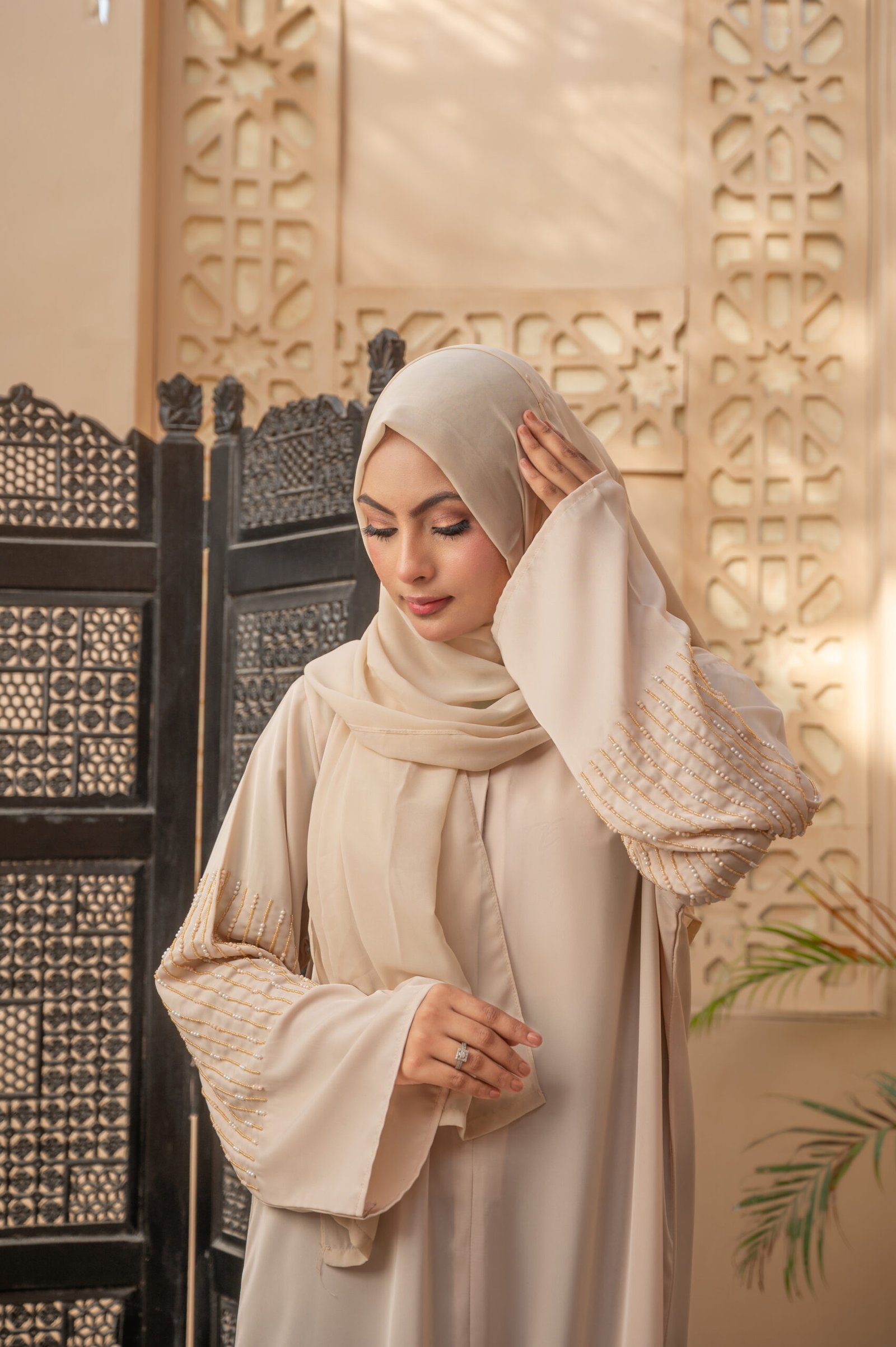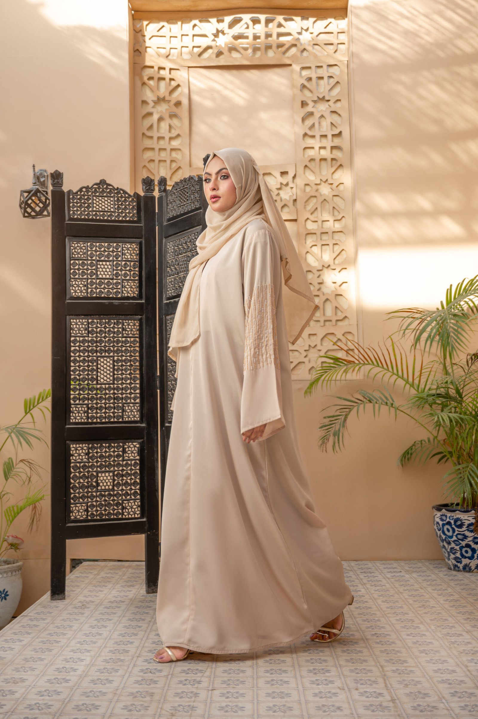 Look elegant in the Jumanah Abaya. Made from soft Nidah fabric in a Light Fawn color, it features stylish beaded details on the sleeves. A matching scarf is included for a complete, modest look. Perfect for any occasion.