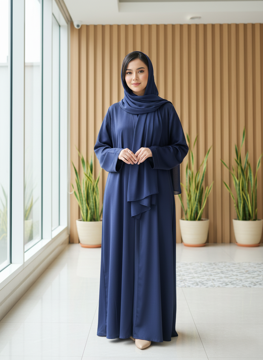 A beautifully tailored blue abaya with a sleek, modern design. Made from a smooth, flowy fabric, it offers an elegant drape and a comfortable fit. The abaya features a clean front panel with minimal detailing, giving it a refined and sophisticated appearance. Paired with a matching hijab, this ensemble exudes a timeless and graceful charm, perfect for both everyday wear and formal occasions.