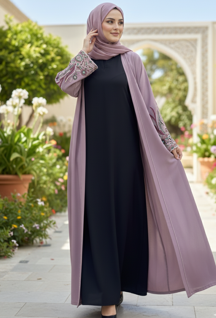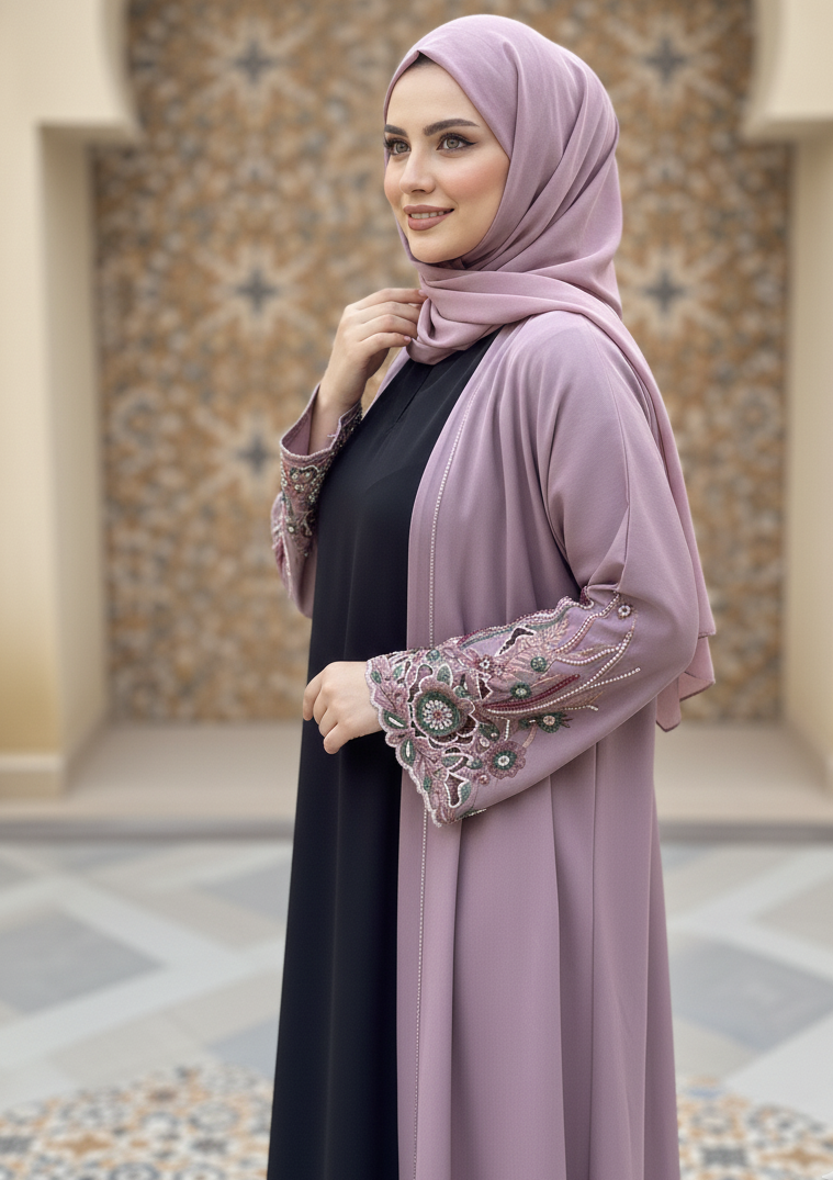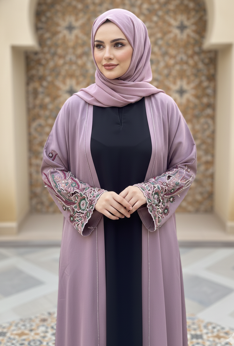 The abaya in the image is an elegant open-style design in a soft lilac shade, paired beautifully with a black inner dress. It features exquisite embroidery on the sleeves, showcasing intricate floral patterns in shades of green, pink, and white, accented with delicate beadwork and thread detailing. The embroidery adds a touch of luxury and artistry, making the abaya stand out while maintaining a graceful modesty. The matching lilac hijab completes the look, creating a refined and sophisticated outfit perfect for festive or formal occasions.