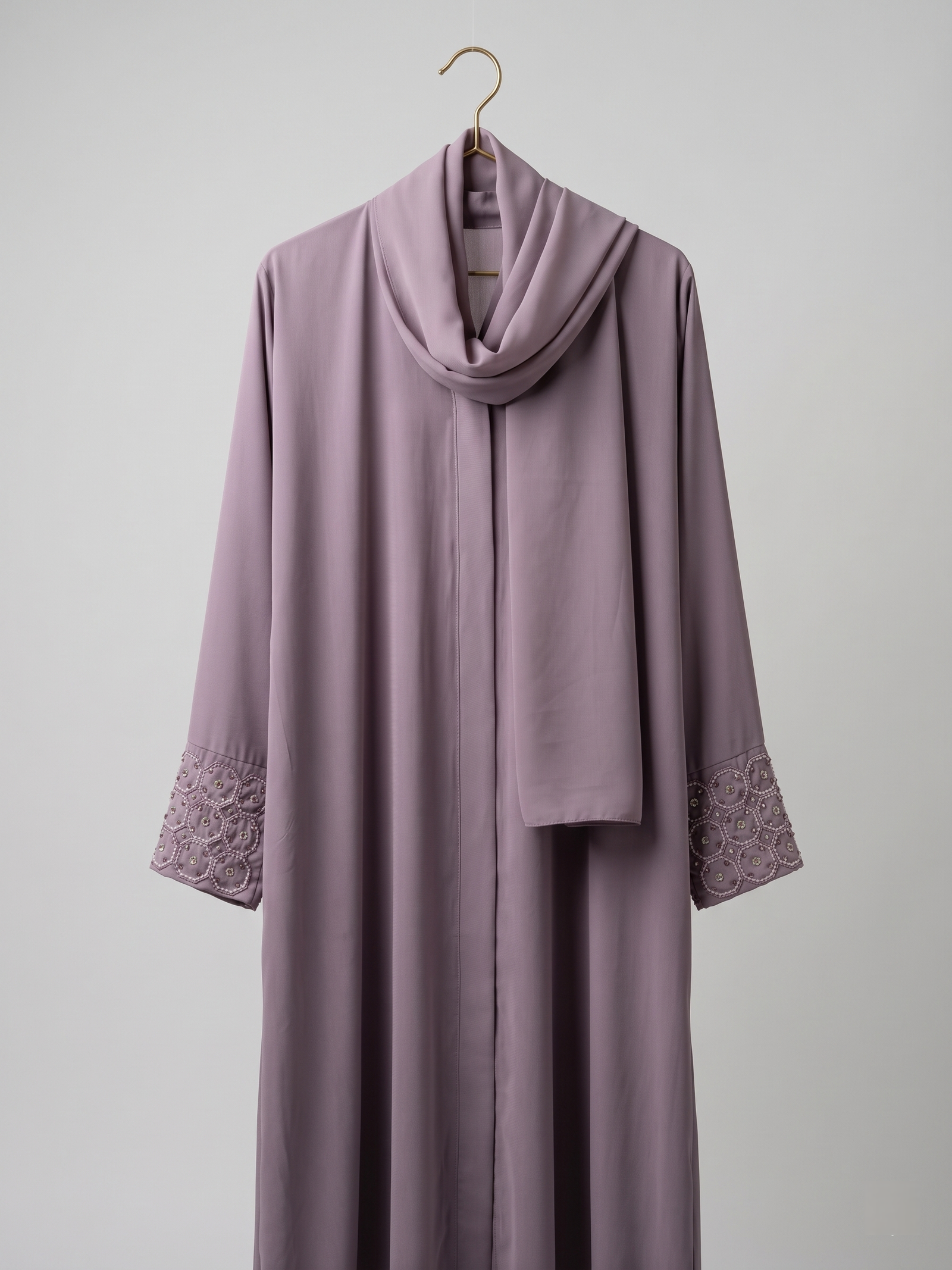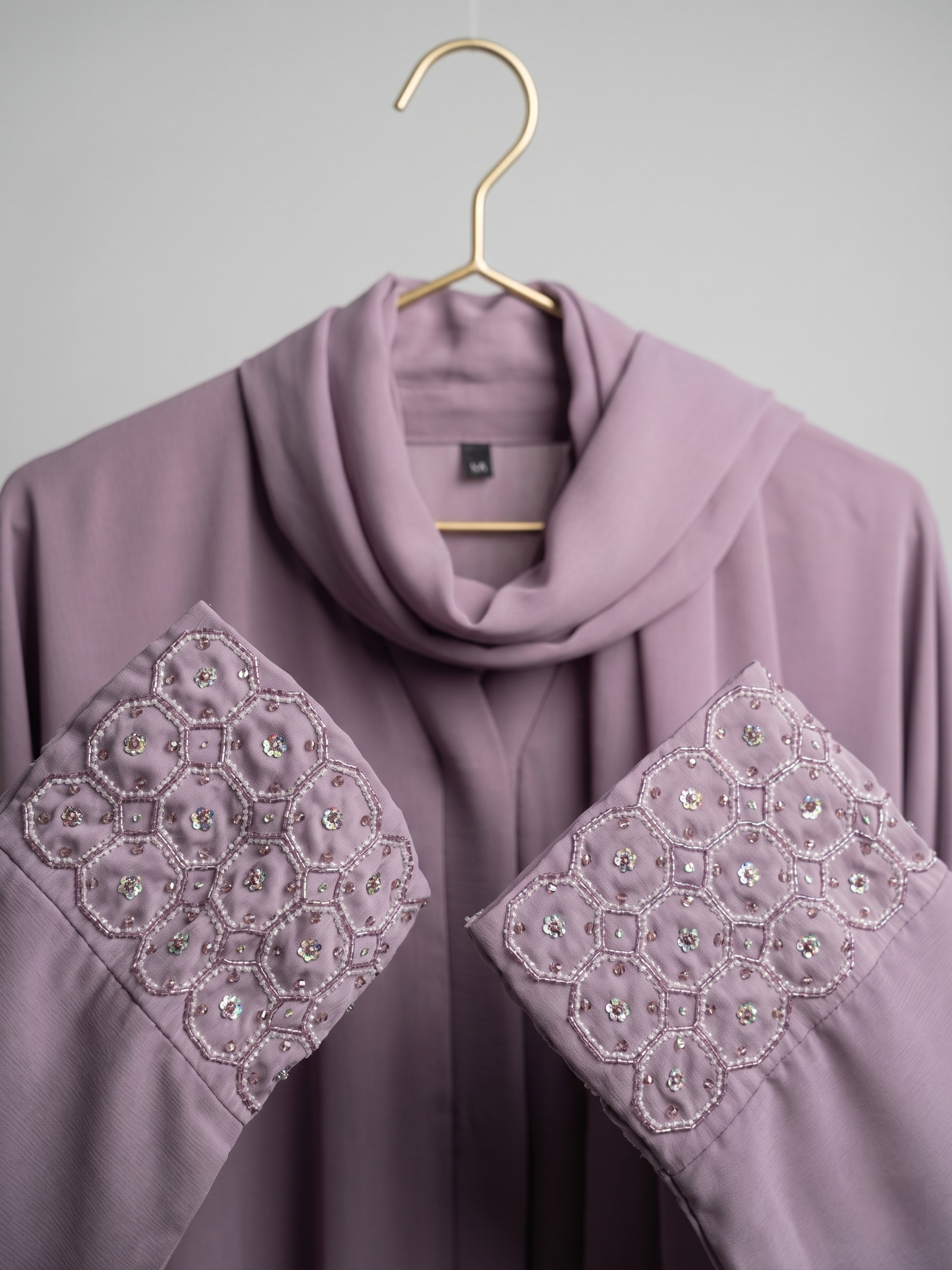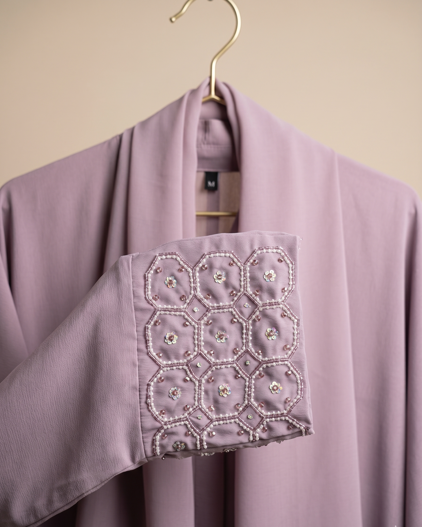 Step into grace with the Maysa Abaya. Crafted from breathable lilac TikTok fabric, it features exquisite hexagonal hand-beading on the sleeves. Lightweight and flowy, this elegant piece comes with a matching hijab for a complete look today.