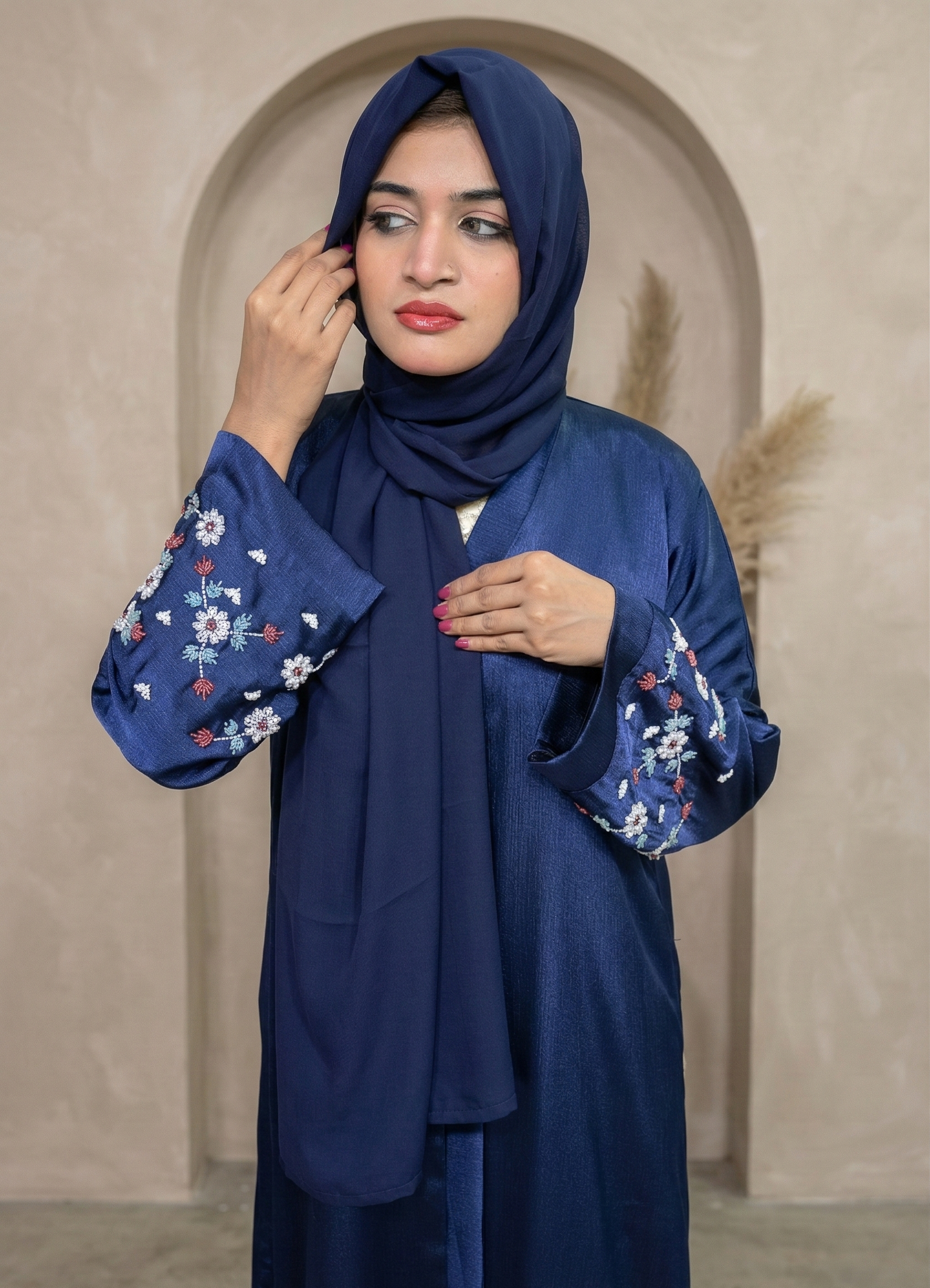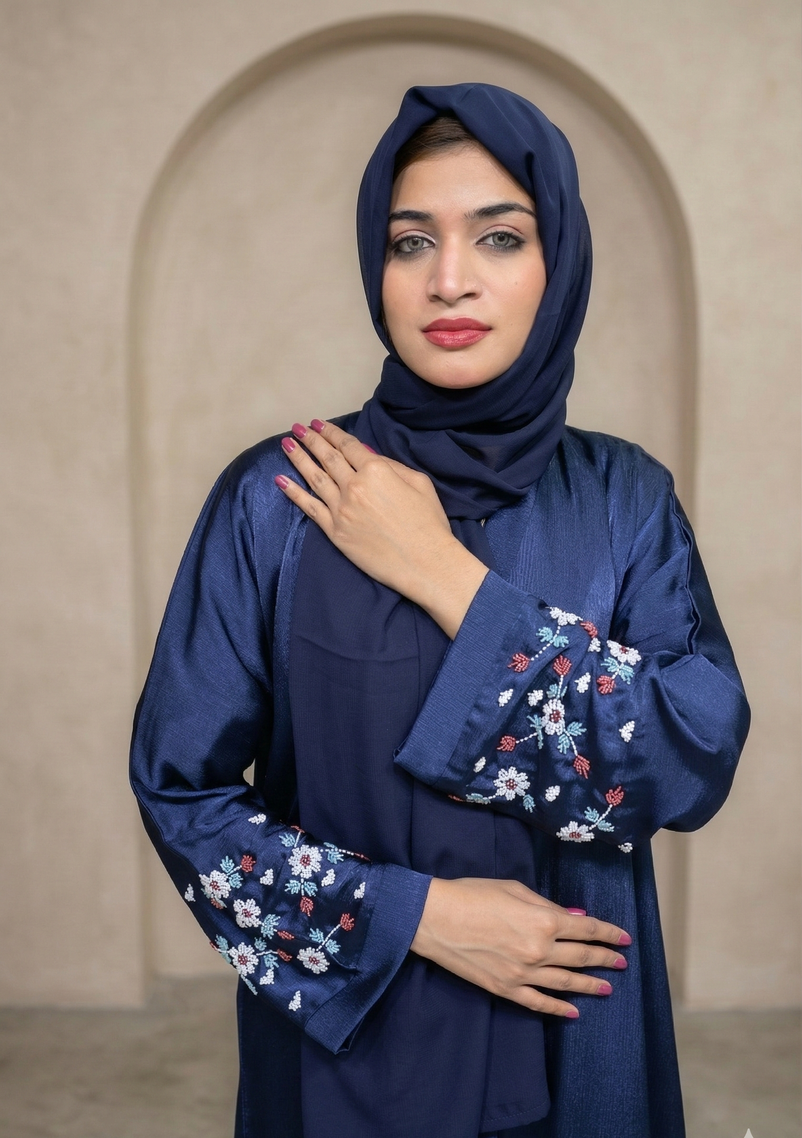Discover the elegance of our Midnight Bloom Abaya. Crafted from a rich, subtly shimmering navy blue fabric, this stunning piece features delicate, hand-stitched floral embroidery along the wide sleeves. Perfect for any special occasion, it pairs seamlessly with a matching hijab for a flawless, sophisticated look. Elevate your collection today.