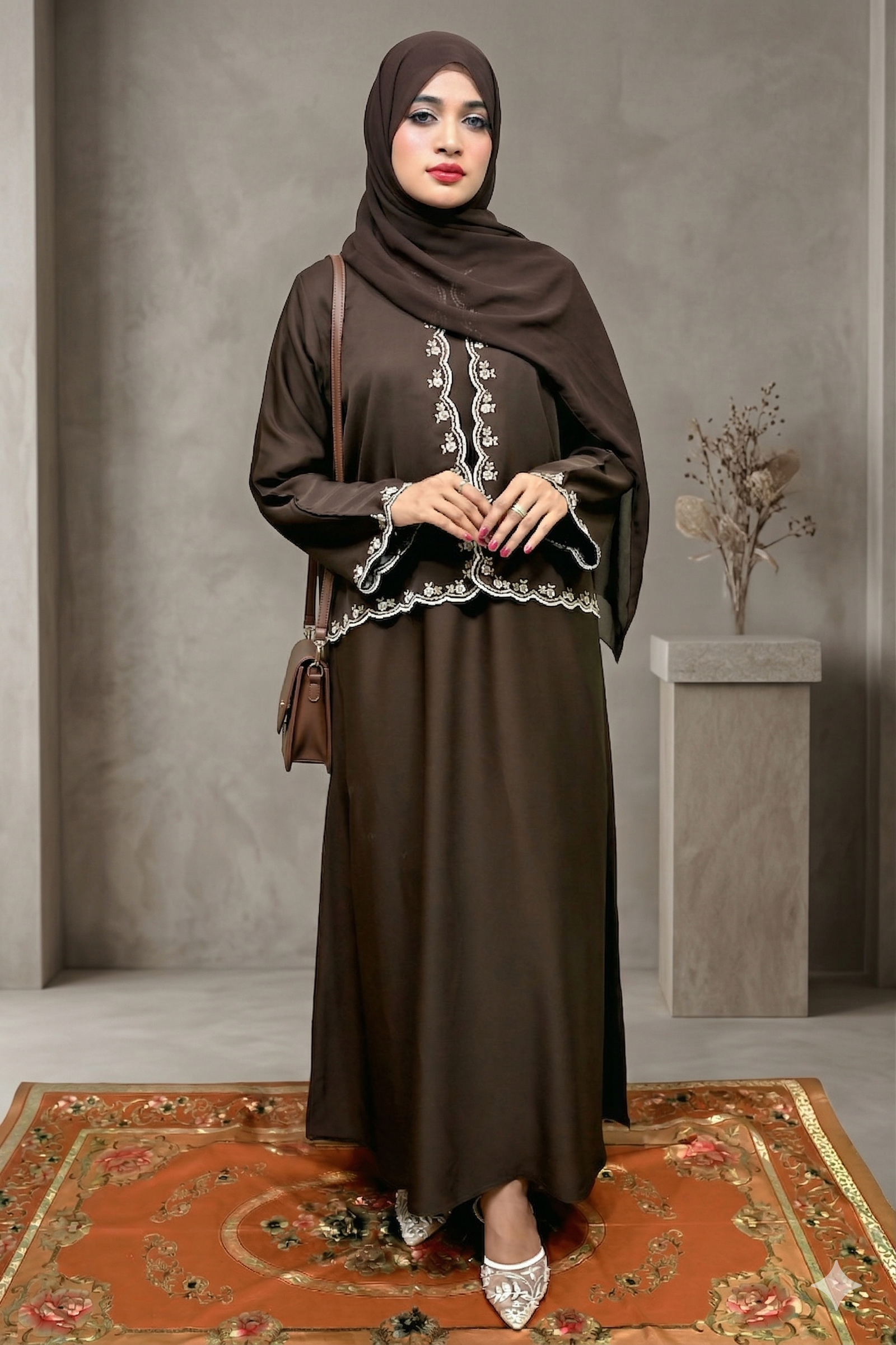 Redefine elegance with our chocolate brown embroidered abaya. Meticulously tailored from premium Nidah fabric, this piece features a sophisticated jacket-style silhouette with delicate white embroidery along the borders and cuffs. The lightweight, breathable material ensures a graceful flow, making it an ideal choice for both formal gatherings and everyday luxury.