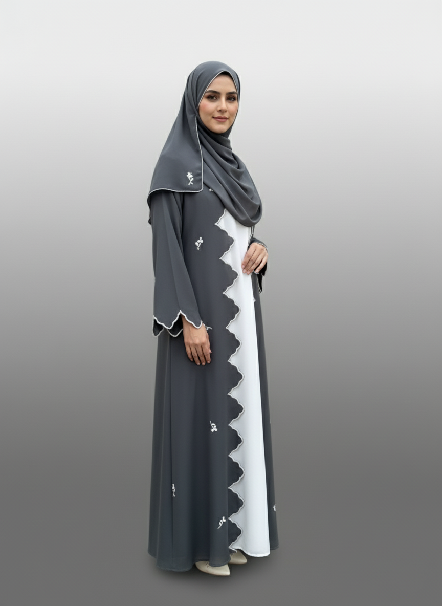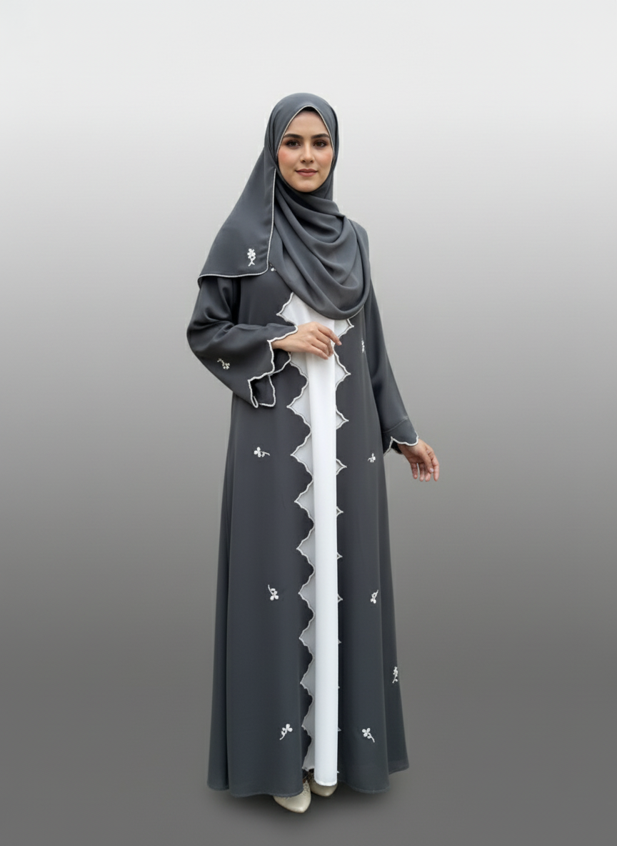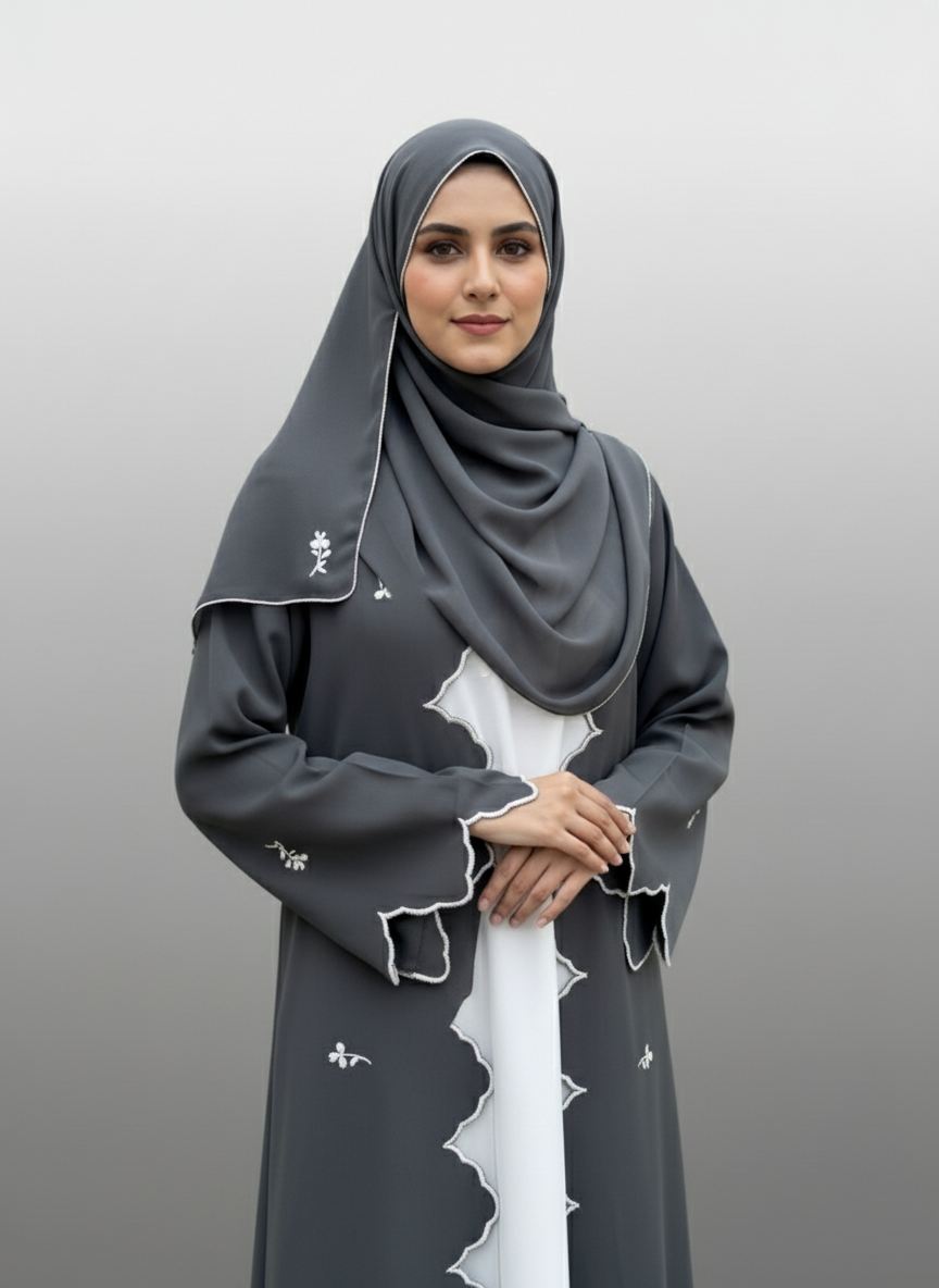 Dark grey abaya and matching hijab. Attire features delicate white embroidery and scalloped edges, blending elegance and simplicity.