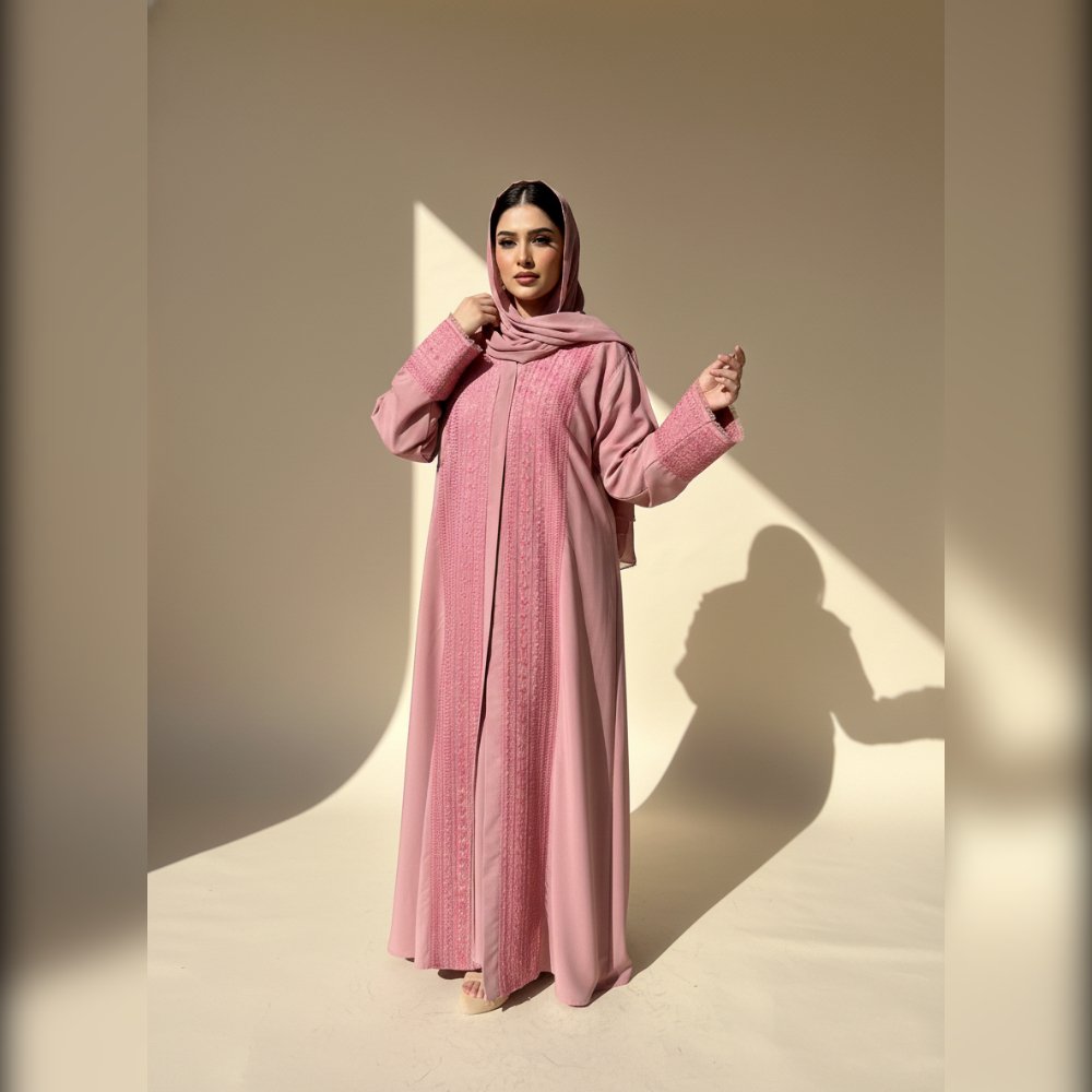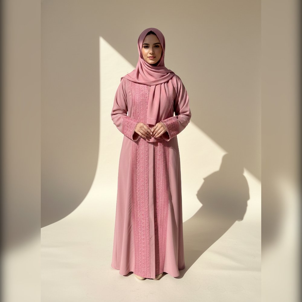 Step into timeless elegance with our Roseate Abaya. The flowing dusty rose fabric and exquisite vertical embroidery detail create a silhouette of effortless grace. Perfect for any occasion where modesty meets sophisticated style.