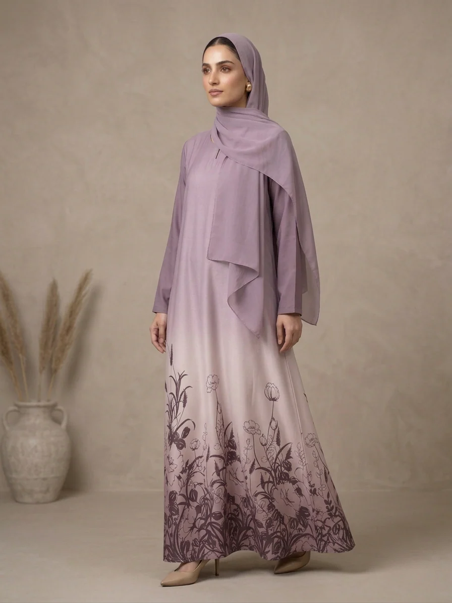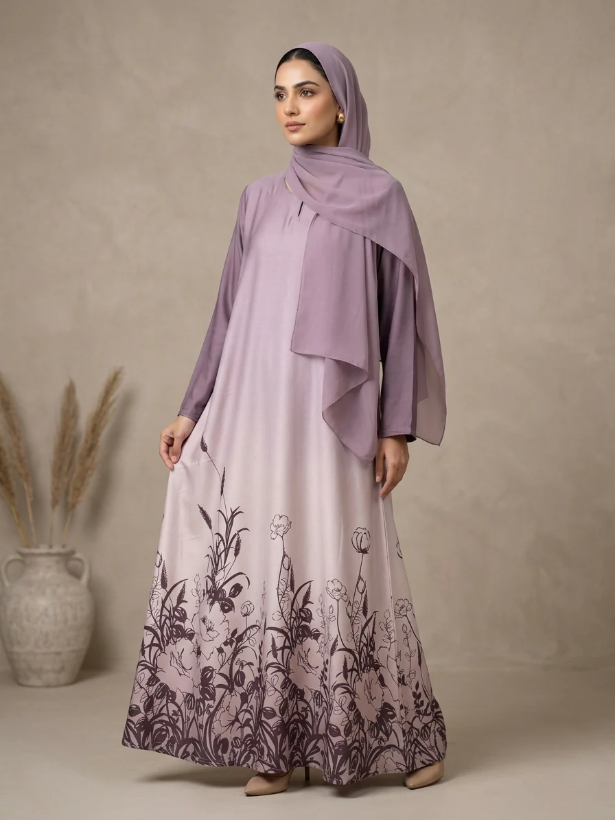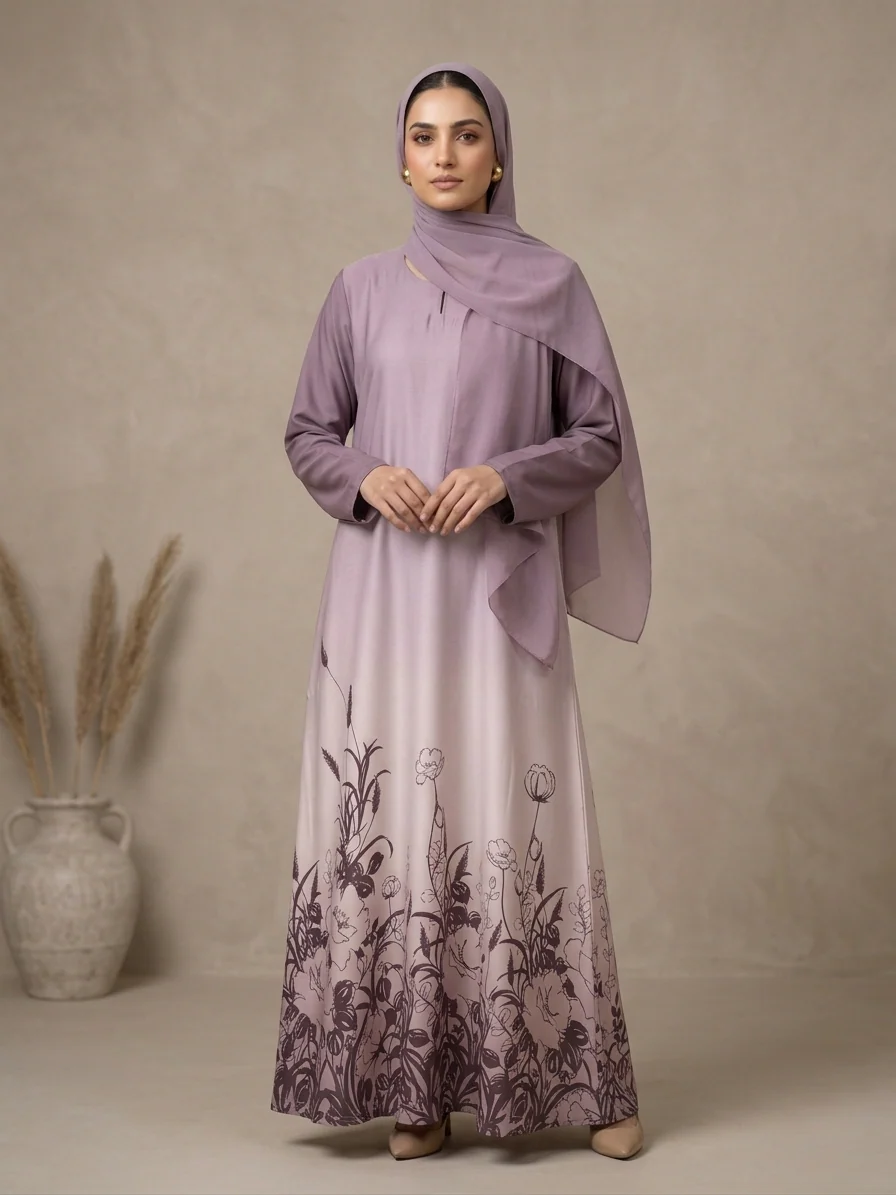 This abaya in a soft blush mauve tone reflects elegance and modern grace. The beautiful ombré effect fades gently into a deeper shade at the hem, enhanced with delicate floral prints that add a subtle artistic charm. Its minimal upper design keeps the look clean and sophisticated, perfect for both everyday wear and special occasions. Comes with a matching hijab for a complete modest look.