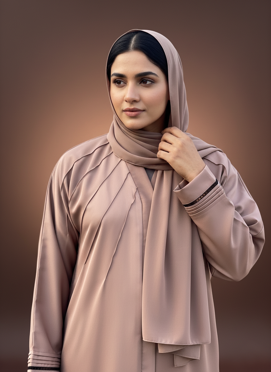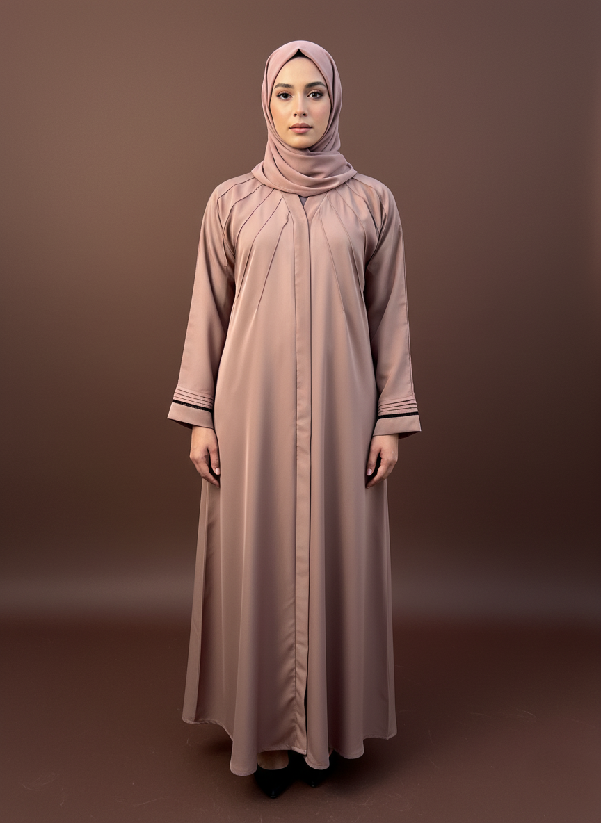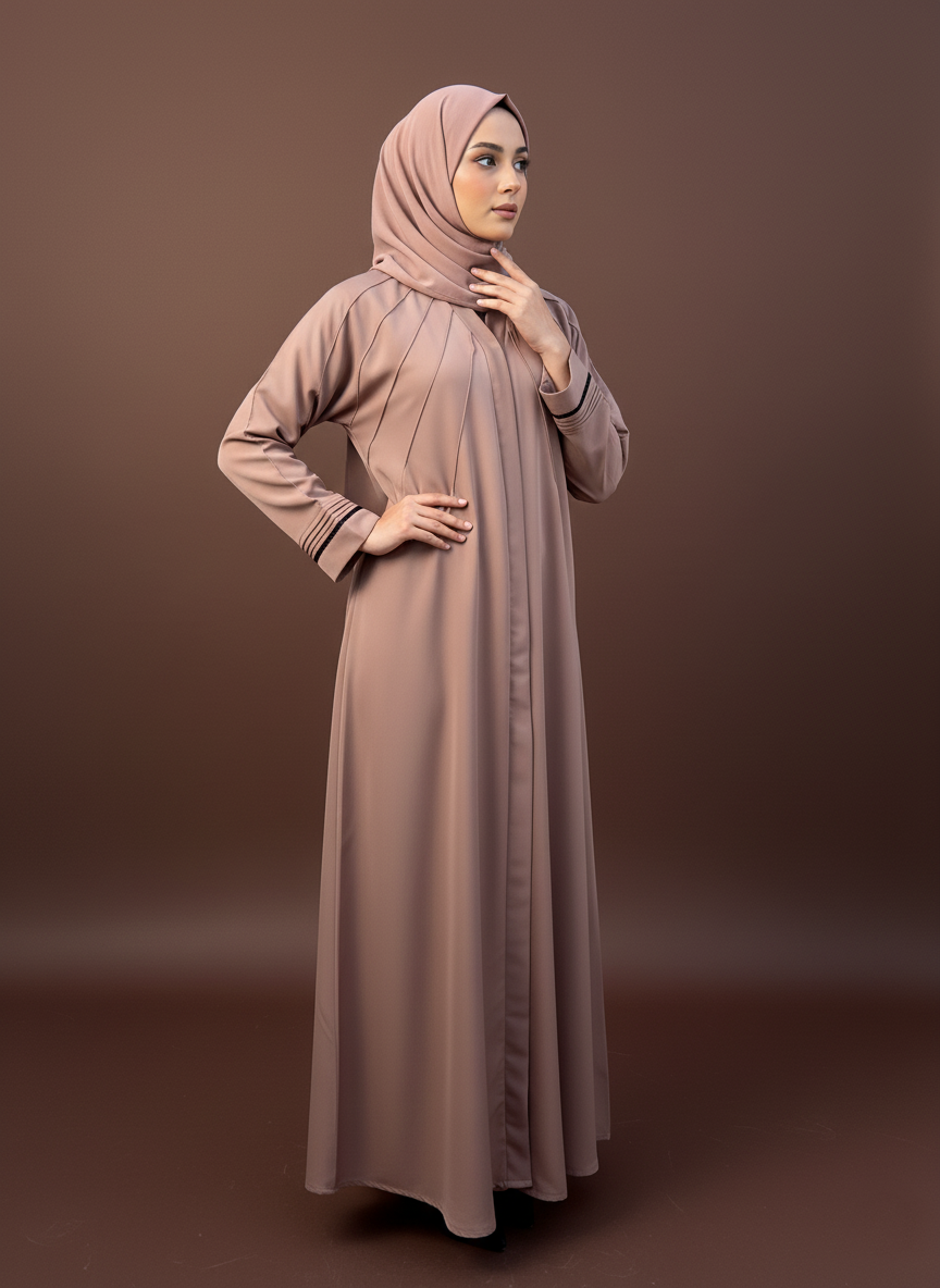 Elegant abaya consisting of a soft taupe shade. The fabric appears smooth and flowy with a satin-like finish, giving it a refined look. The abaya features pleated detailing on the front, adding a touch of sophistication and structure. The sleeves have fine stitched accents with a dark lace near the cuffs, giving a subtle contrast.
